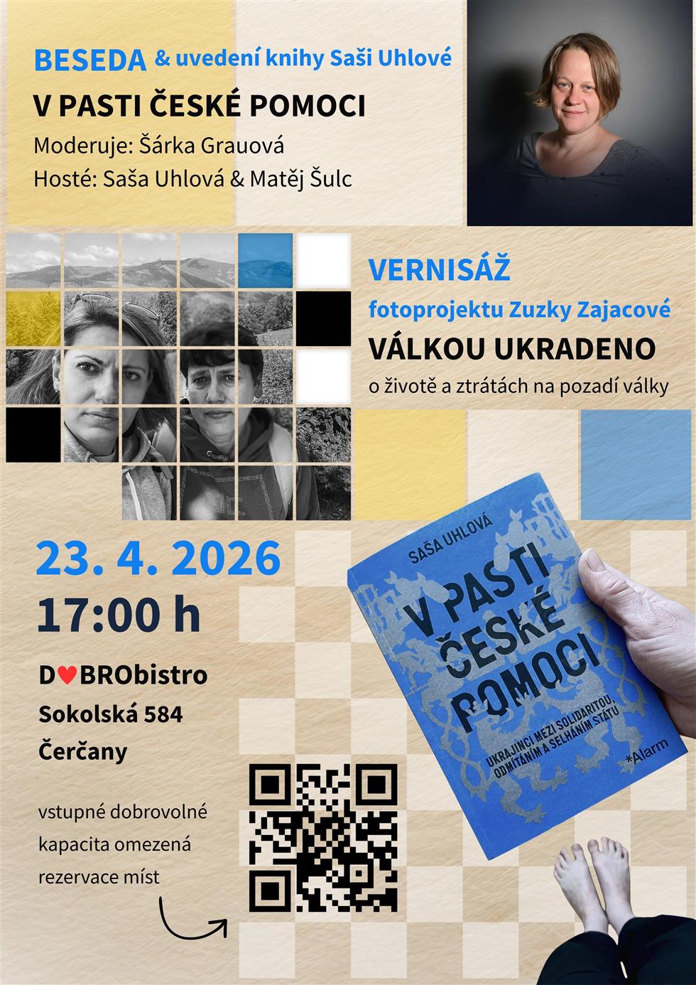 Srdečně vás zveme na uvedení knihy Saši Uhlové V PASTI ČESKÉ POMOCI aneb Ukrajinci mezi solidaritou, odmítáním a selháním státu, a na zahájení vernisáže fotoprojektu Zuzany Zajacové a Petry Vávrové VÁLKOU UKRADENO, který zachycuje život a ztráty na pozadí války.